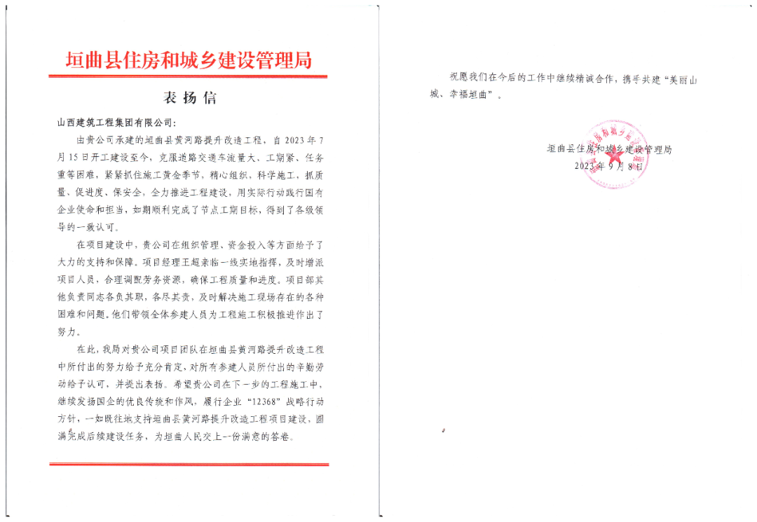 9月8日,由建工集团路桥工程公司承建的����� �������Ƴ������������ �������Ƴ������������ �������Ƴ������������ �������Ƴ�������垣曲县黄河路提升改造工程收到垣曲县����� �������Ƴ������������ �������Ƴ����������� �������Ƴ������������ �������Ƴ�������住房和城乡建设管理局的表扬信����� �������Ƴ������������ �������Ƴ����������� �������Ƴ������������ �������Ƴ�������,垣曲县住房和城乡建设管理局对����� �������Ƴ������������ �������Ƴ������������ �������Ƴ������������ �������Ƴ�������公司在工程建设过程中的高����� �������Ƴ������������ �������Ƴ������������ �������Ƴ������������ �������Ƴ�������度重视、精心组织,科学施工及全力推进工����� �������Ƴ������������ �������Ƴ������������ �������Ƴ������������ �������Ƴ������程建设,表示充分肯定和赞扬。