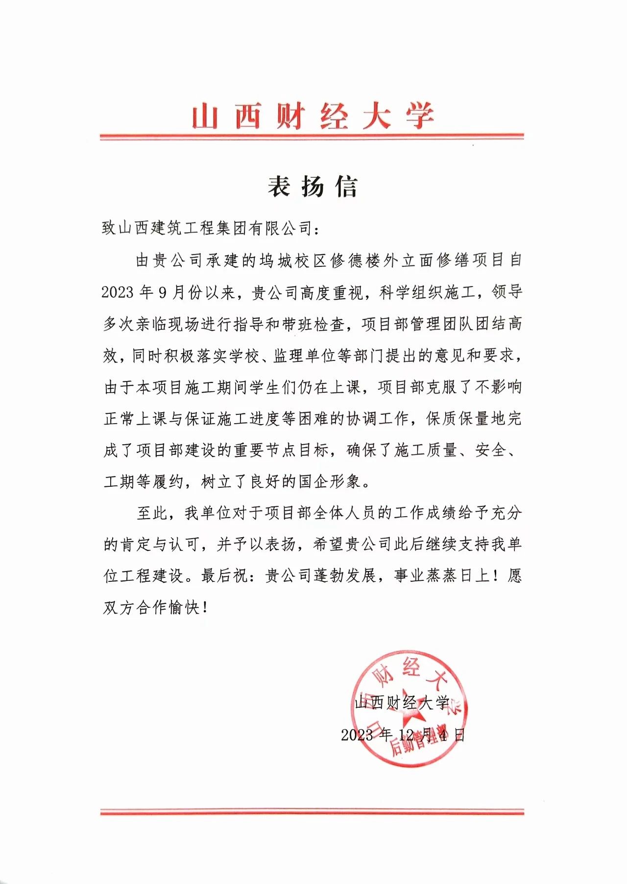 近日,山西财经大学坞城校区修德����� �������Ƴ������������ �������Ƴ������������ �������Ƴ������������ �������Ƴ�������楼外立面修缮项目收到来自山西财经大学����� �������Ƴ������������ �������Ƴ����������� �������Ƴ������������ �������Ƴ�������的表扬信。信中对项目管理团队团结高效,科学组织����� �������Ƴ����������� �������Ƴ������������ �������Ƴ������������ �������Ƴ�������施工,盯目标任务,严把时����� �������Ƴ������������ �������Ƴ����������� �������Ƴ����������� �������Ƴ�������间节点,克服各种困难,确保质量安全,圆����� �������Ƴ������������ �������Ƴ����������� �������Ƴ������������ �������Ƴ�������满完成施工任务给予高度评价,对与公司的����� �������Ƴ������������ �������Ƴ����������� �������Ƴ����������� �������Ƴ�������合作前景寄予厚望。