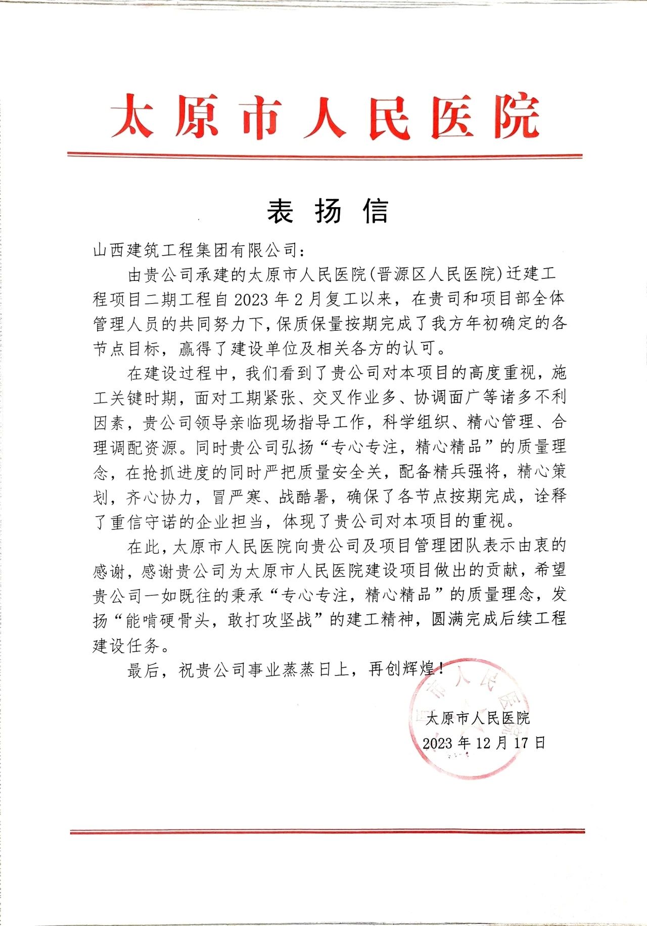 太原市人民医院(晋源区人民医院)����� �������Ƴ������������ �������Ƴ������������ �������Ƴ������������ �������Ƴ�������迁建工程项目二期收到表扬信