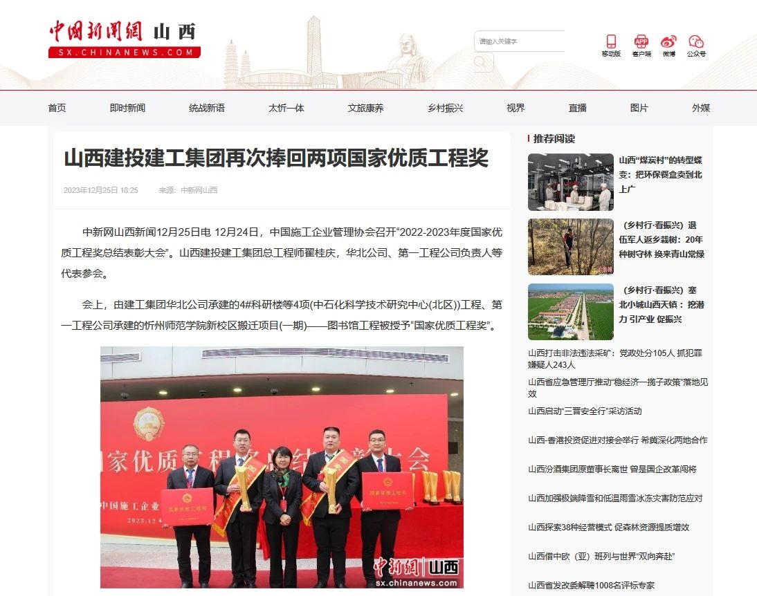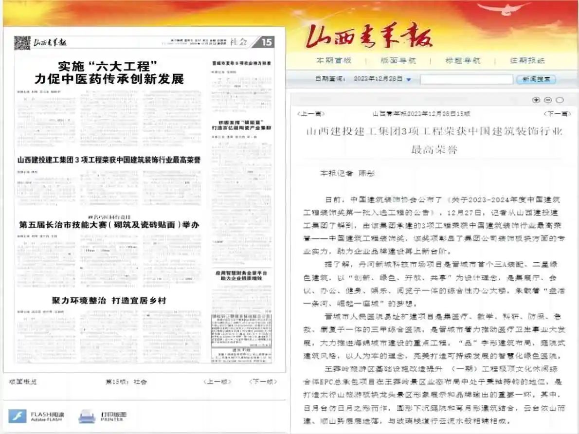 山西青年报报道了建工集团3项工程荣获中国����� �������Ƴ������������ �������Ƴ������������ �������Ƴ������������ �������Ƴ�������建筑装饰行业最高荣誉的新闻。